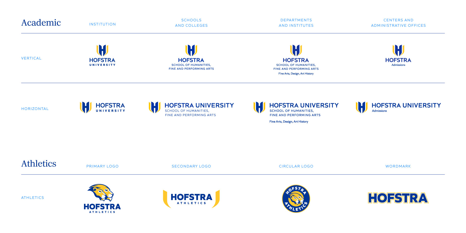 We designed a bold new logo, a modern symbol combining the tulip from Hofstra’s Dutch heritage, an open book, and an institutional shield into a monogram. Alongside this core identity, we redesigned Hofstra’s iconic athletics lions, creating a suite of marks for use across its wide range of sports programs. We preserved the equity of the university’s blue and yellow colors; augmented them with a supporting palette; and created a new design system grounded on grid systems, motion, and a symbol-based language. Custom glyphs, inspired by iconic campus landmarks, conveyed mood and a strong sense of place. A dedicated photoshoot generated a library of branded imagery, video, and drone footage to support a polished and authentic visual aesthetic.